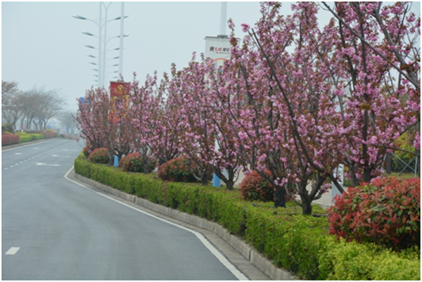 為把園區(qū)青海湖西路打造園區(qū)“櫻花大道”,按管委會(huì)部署,開發(fā)公司市政工程管理部對(duì)青海湖西路的行道樹進(jìn)行整體更換,用櫻花代替原長勢不佳的廣玉蘭,經(jīng)過兩年的精心養(yǎng)護(hù),整體長勢良好,每逢春季來臨櫻花盛開,為園區(qū)的景觀增添亮點(diǎn),成為一道獨(dú)特靚麗的風(fēng)景線。