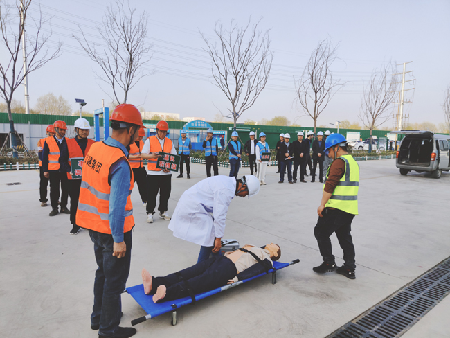 本次演練共分6個(gè)小組,分別為:現(xiàn)場模擬組、現(xiàn)場警戒(搶修)組、應(yīng)急救援(疏散)組、通訊聯(lián)絡(luò)組、事故調(diào)查組、 觀摩組。假設(shè)工人在生活區(qū)違規(guī)使用大功率電器突發(fā)火災(zāi),被煙霧和火勢圍困,二樓有人發(fā)出救援信號(hào),正在附近巡查的安全員發(fā)現(xiàn)情況后,立即趕赴現(xiàn)場并打電話給項(xiàng)目生產(chǎn)負(fù)責(zé)人,在接到通知后,項(xiàng)目生產(chǎn)負(fù)責(zé)人迅速安排項(xiàng)目部應(yīng)急救援辦公室負(fù)責(zé)人,并啟動(dòng)應(yīng)急預(yù)案,各救援小組立即到達(dá)現(xiàn)場開展工作,安全員迅速引導(dǎo)全體人員有序從疏散樓梯疏散到安全位置,救援組帶著擔(dān)架、急救箱等趕赴現(xiàn)場,將“受傷”人員用擔(dān)架從房內(nèi)撤離到安全位置,同時(shí)救援醫(yī)生對“受傷”人員進(jìn)行簡單的心肺復(fù)蘇、人工呼吸,并迅速送往醫(yī)院進(jìn)行治療。