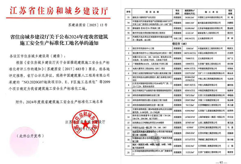 近日,江蘇省住房和城鄉(xiāng)建設(shè)廳發(fā)布了《2024年度江蘇省建筑施工安全生產(chǎn)標準化工地名單》,由園區(qū)城發(fā)公司負責建設(shè)管理的蘇宿工業(yè)園區(qū)智慧信息產(chǎn)業(yè)園土建及安裝工程位列其中。