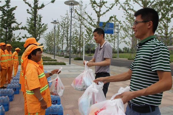 朱亞楠表示,園區(qū)環(huán)衛(wèi)工人頂著烈日,為恒大集團等園區(qū)企業(yè)創(chuàng)造了整潔、優(yōu)美的城市環(huán)境,他代表恒大集團宿遷項目全體人員向他們致以誠摯的敬意和謝意。許紹杰也對奮戰(zhàn)在一線的環(huán)衛(wèi)工人表示感謝和祝福,多次叮囑他們高溫作業(yè)要注意安全,勞逸結(jié)合。