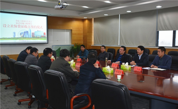 12月1日下午,園區(qū)管委會(huì)與宿遷市地稅局舉行設(shè)立社保費(fèi)征收點(diǎn)簽約儀式。副市長(zhǎng)、園區(qū)黨工委書(shū)記、管委會(huì)主任方文浜,市地稅局局長(zhǎng)王月明,園區(qū)工委領(lǐng)導(dǎo)戈亮、高揚(yáng)出席簽約儀式。